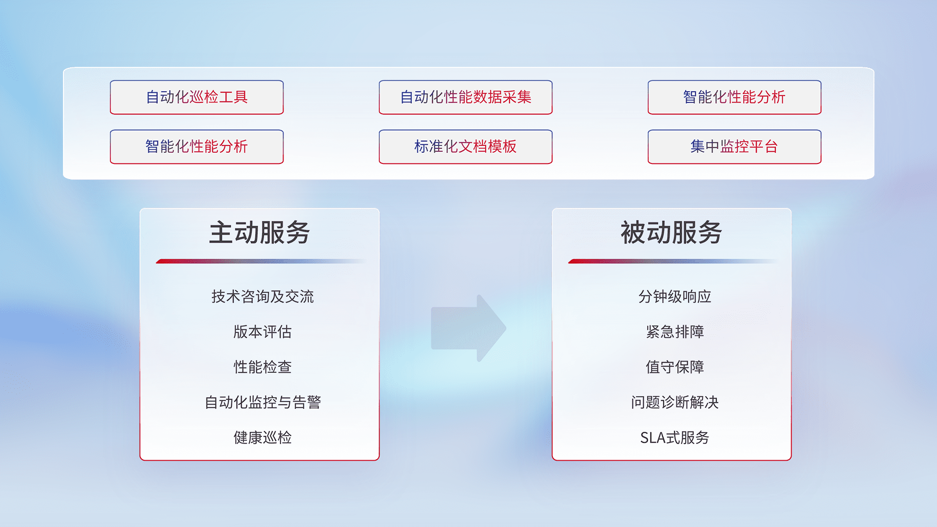 智能化工具和标准化文档,,,,保障服务质量,,,提供主动服务(包含技术咨询、、版本评估、、、、性能检查、、自动化监控与告警、、、、健康巡检)和被动服务包含(分钟级响应、、、紧急排障、、值守保障、、、、问题诊断解决、、、、SLA服务)。。。。